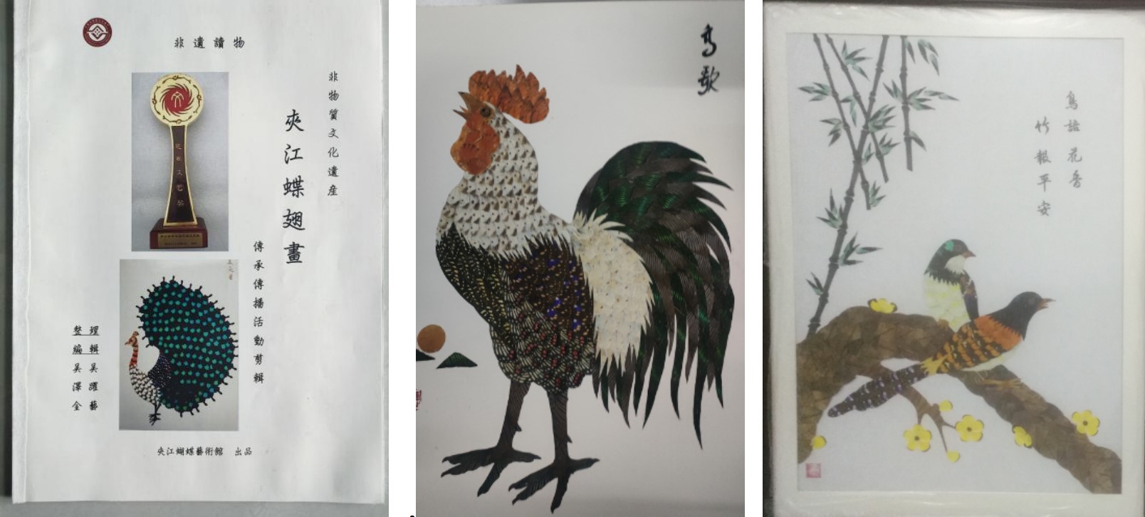 画材取于蝴蝶之翅,利用其独特的纹理剪贴而成。蝶翅画的最大艺术特色是不做任何饰染,以蝶翅的天然色彩和花纹使得画面五彩斑斓,惟妙惟肖。蝶翅上的磷粉光泽还会使画面产生熠熠生辉的奇妙效果。